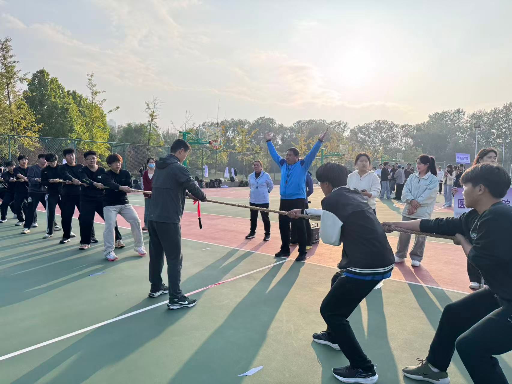 拔河赛场硝烟四起,队员们齐心协力,以绳为刃,向胜利发起冲锋!