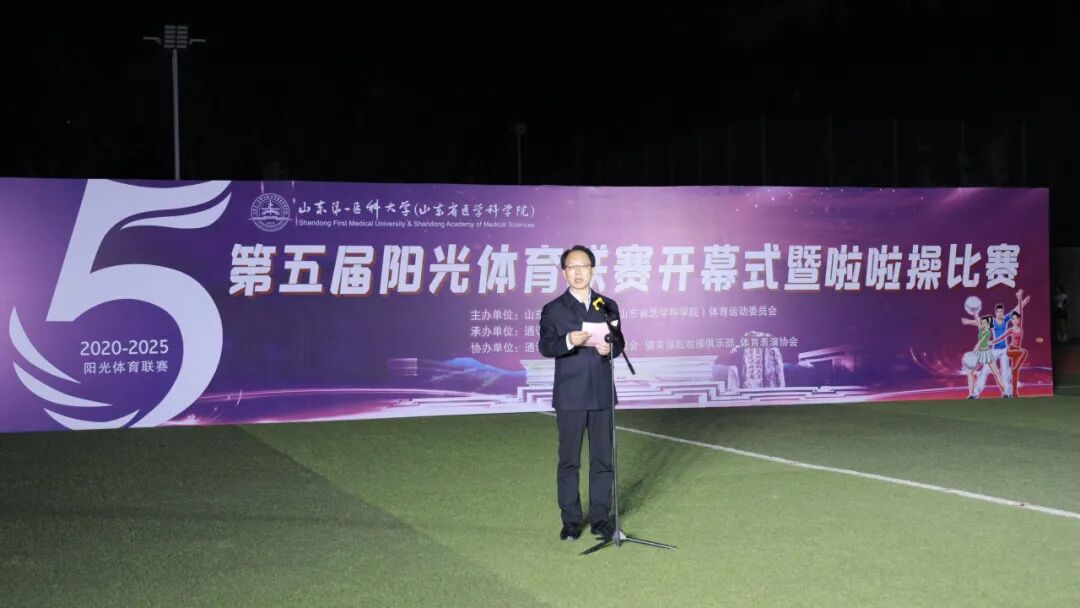 为弘扬体育精神,营造阳光、活力、团结的校园体育文化,充分展现山一大学子风采,4月25日,校(院)第五届阳光体育联赛开幕式暨啦啦操比赛在泰安校区隆重举行。校(院)党委委员、副校(院)长贾海宁出席本次活动并致辞,学生工作部、教务部、团委、泰安校区管委会、各学院及通识教育部相关负责人参加了活动。